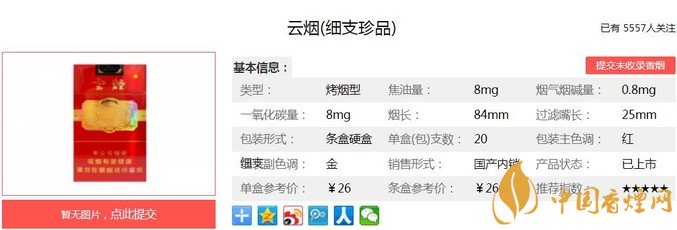 云煙細支珍品煙支長84mm,過濾嘴長25mm,以滿足消費者需求為宗旨,云南中煙堅持守正出奇,賦予云煙細支珍品更趨豐富的吸味、更加愉悅的享受、更富文化感的設計。下面我們一起來看云煙細支珍品的參數信息:焦油量:8mg 煙堿量:0.8mg 一氧化碳量:8mg