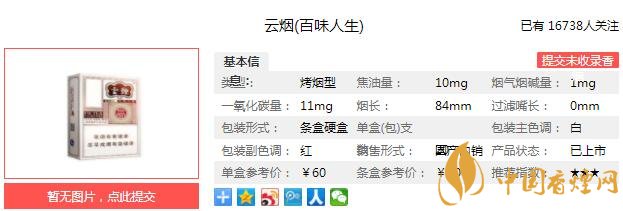 云煙百味人生優選世界香料,取典型天然香韻,提取爆珠,賦予獨特香味風格吸味,與本香完美融合。選擇捏爆爆珠,感受爆珠香氣與煙草本香完美融合帶來的獨特的風格吸味,煙味醇厚,豐富甜潤,領尚五味。經香煙網小編市場調查云煙百味人生售價為60元/包。
