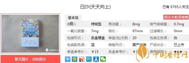 保持白沙品牌醇和的產品風格,突出香氣豐富厚實、飄逸和余味純凈、津甜的質量特色。以優雅煙草本香和煙草成熟甜香為底韻,襯以堅果香、清新果甜香;香氣細膩、飄揚、豐富、綿長;煙氣悠滿、醇和;口感生津返甜。。經香煙網小編市場調查白沙天天向上售價為15元/包。