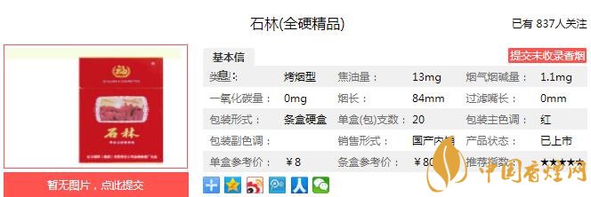 石林全硬精品是石林品牌系列的高品位卷煙。該產品繼承和發揚了“石林”牌系列卷煙的有毒,自然優雅,煙氣飽滿綿長,煙氣醇和的,口感和余味更加干凈舒適,香氣越來越細膩柔和。只可惜目前這款石林全硬精品已經停止生產,市面上已經很少見了。