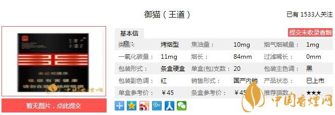 御貓王道煙支長84mm,過濾嘴長25mm,集津、巴、贊三國進口富硒煙葉,三香合一。36道工序,專一工藝線,充分梅拉德反應致本香、清香、御香于一體形成獨特風格。下面我們一起來看御貓王道的參數信息:焦油量:10mg 煙堿量:1.0mg 一氧化碳量:11mg