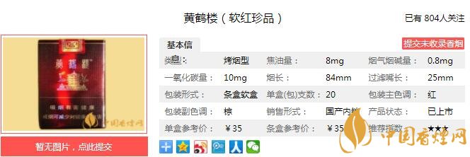 黃鶴樓(軟紅珍品)煙支長:84mm,烤煙型,過濾嘴:30mm,包裝形式:條盒軟盒(每盒 20支,每條 10 盒)。煙支是激光鐳射水松紙,觸感平滑,以豎排形式印有篆字“黃鶴樓”,濾嘴是“梅花形鏤空聚香濾棒”。我們一起來看黃鶴樓(軟紅珍品)的參數(shù)信息:焦油量:8mg 煙堿量:0.8mg 一氧化碳量10mg。