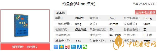 釣魚臺84mm細支煙支長84mm,過濾嘴長25mm,比普通的細支香煙要短了不少,小巧精致,拿在手里十分精致,煙絲填充飽滿,做工細致。下面我們一起來看釣魚臺84mm細支的參數(shù)信息:焦油量:7mg 煙堿量:0.7mg 一氧化碳量:6mg