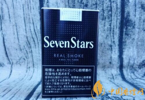 煙盒的正反及左右兩側均以白色的小五角星為圖案,橫平豎直地排列開來。與其它Seven Stars版本一樣,位于煙盒正反兩面中間都有阿拉伯數字“7”的標識。REAL  SMOKE,直譯成中文是“真煙,真正的香煙”之意。A  BOLD  FULL  FLAVOR,中文意思是“煙味十足”。綜合意思,是說此款日稅黑七星的品質之高。