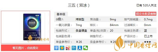 555牌卷煙創(chuàng)牌于1895年,創(chuàng)始人Albert Levy爵士在美國獲得靈感并在英國注冊(cè)State Express 555品牌,是英美煙草公司出品的有著悠久歷史的著名品牌,國內(nèi)煙民熟悉的有555金、555弘博、555環(huán)尊、555藍(lán)尚、555國際等品種和系列。555屬英式烤煙型卷煙。下面就由香煙網(wǎng)小編帶大家一起來了解三五雙冰的相關(guān)信息。