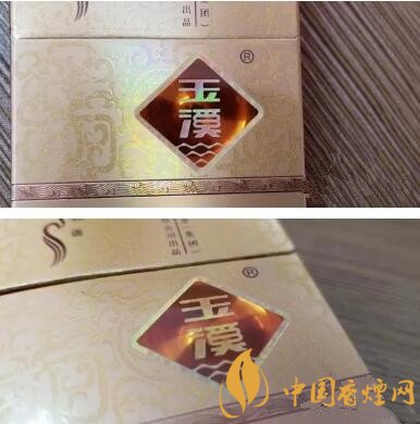 新版與老版正面其他的差別還有兩處:一是,右上角上蓋右側,紅塔煙草(集團)有限責任公司的文字標識,老版是在豎條的右側,新版則分列豎條的左右兩側;二是,煙盒居中右側的“玉溪”Logo,老款是深棕色單色底色,新版則是是淺棕色帶激光同心圓反射底紋。和版面的紋飾配合比較協調,也更靈動一些。