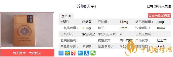 蘇煙天星煙支長84mm,采用國際最新的DCC+HXD技術,從外觀設計到內在品質都力求尊貴、精工制作、手工打造,追求最高品質、最高檔次、最高品位。下面我們一起來看蘇煙天星的參數信息:焦油量:11mg 煙堿量:1.0mg 一氧化碳量:11mg