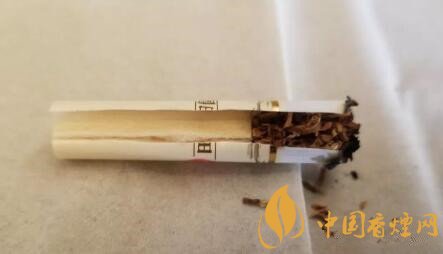 剖開濾嘴,為一段式的醋酸纖維絲束。沒有開降焦孔,絲束顏色淺黃,如此填充緊實的煙支,很不錯!絲束上有條帶狀色深帶,是豎紋盤紙導氣所致。