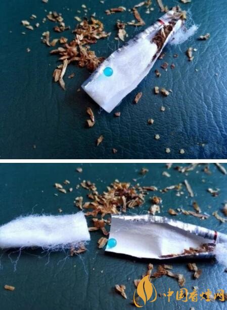 下面兩張圖片,是過濾嘴中內置爆珠剪開后的構造。爆珠的顏色為藍色,里面的海綿是一段完整未分離的樣式。