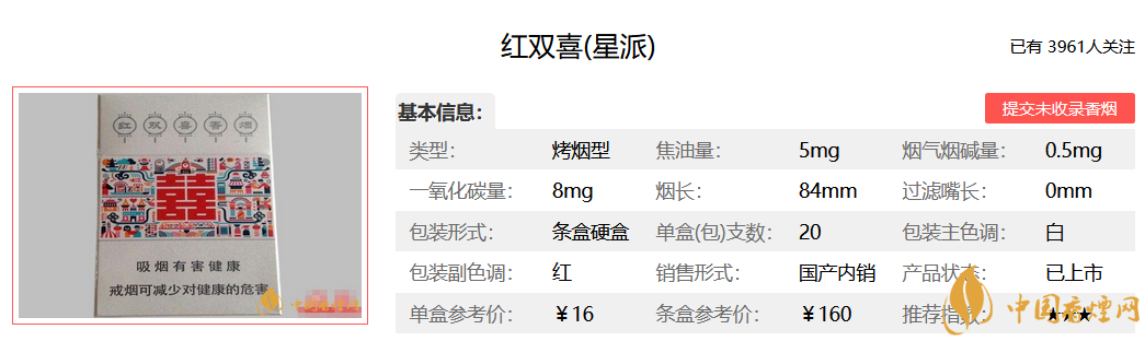 紅雙喜(星派)香煙價格參數(shù)