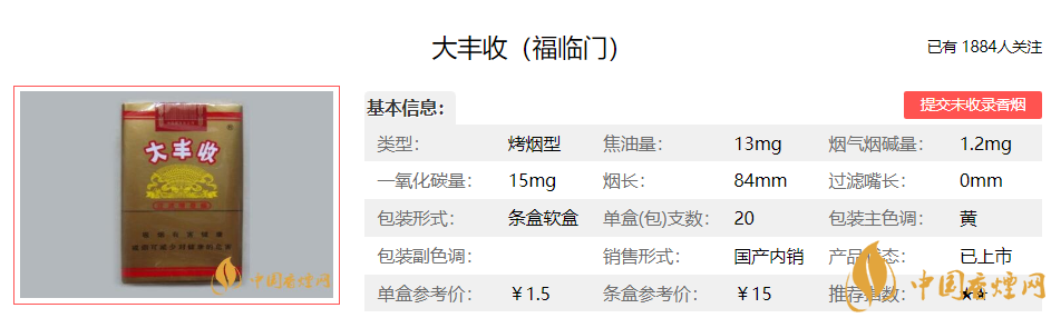"大豐收"品牌是國家煙草專賣局為適應農村消費者和低收入群體的需求,首個重點扶持的低檔全國性牌號卷煙。精心選擇原輔材料和香精香料。使其聞香甜潤,煙香醇和,口感舒適,勁頭適中。