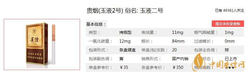貴煙創(chuàng)牌于1978年,距今已有四十多年的歷史了,貴煙在煙草市場(chǎng)一直是享譽(yù)盛名。今天香煙網(wǎng)為大家介紹一款貴煙玉液2號(hào)香煙。下面是貴煙玉液2號(hào)的價(jià)格參數(shù)以及抽過(guò)的煙民對(duì)這款煙的評(píng)價(jià),一起來(lái)看看吧。