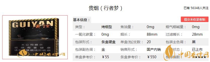 貴煙(行者夢)香煙55元/包,也是2019年新推出的產品,焦油量:9mg,煙堿量:0.9mg,一氧化碳量:8mg,外包裝經典大氣。