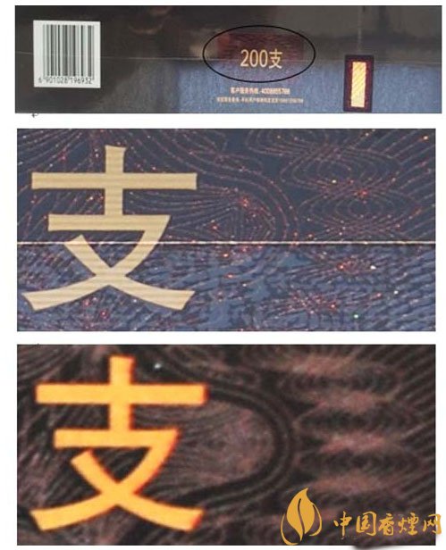 真煙采用超細線防偽,線條交叉處條紋清晰,不粘連;假煙超細線處印刷粗糙,交叉處粘連、模糊。
