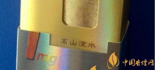 煙盒正面翻蓋處左側凹凸燙印有一縱列的金黃色數字‘1’,里還暗印著煙葉紋路。貫穿著深紅與亮銀兩色間。順下鏤空金黃底印著褐色副牌名稱‘高山流水’四字。 整體風格明快、大氣、個性鮮明。既體現了低焦油的產品特點,也寓意了敢于創新、銳意進取的領航者風范。
