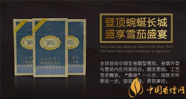 這款長城雪茄煙茄體長度94mm ,直徑7.88mm,環徑19.5mm,每個黃色的煙蒂上都印有藍色印花,其中兩條藍白色相間的環抱紋設計顯得長城醇雅薄荷煙很有層次感,綜黃色的茄身小巧精致卻又顯得纖細而挺拔。#p#副標題#e#