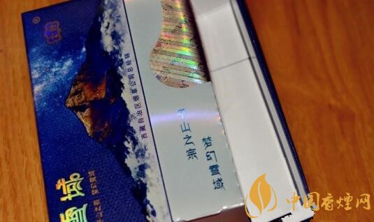 我們在說云煙雪域怎么樣的時候,它的外觀也是非常有特色的。云煙雪域整體配色為藏青色,首先進入眼簾的便是一座雪山聳立云端之上,帶有一些藏文色彩的雪域兩字被印在煙盒左上角,下面連帶兩排小字:千山之宗,夢幻雪域,令人心向神往,背面的圖案則是一眾群山,中間像是一個畫框,整體感覺非常新穎。