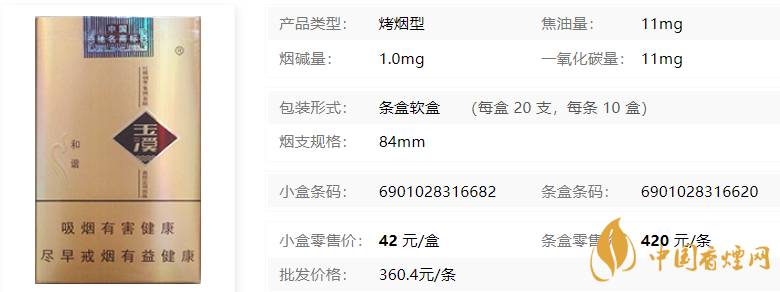 類型 :烤煙型 焦油量 :11mg 煙氣煙堿量 :1mg 一氧化碳量 :11mg
