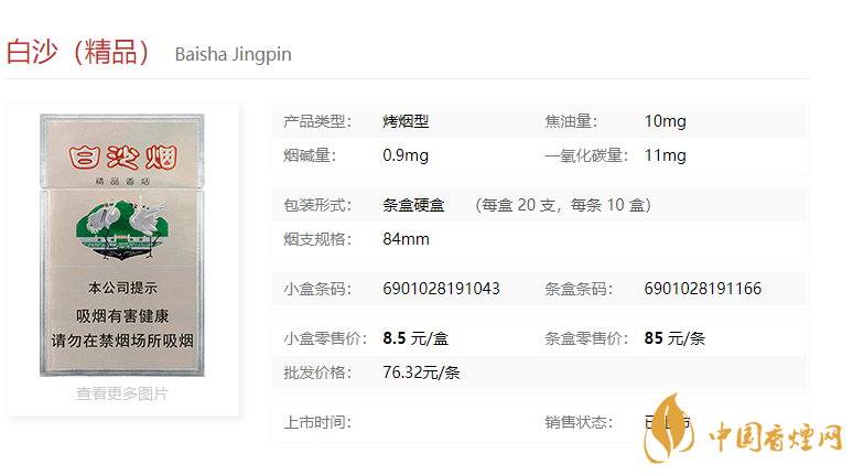 精品白沙,烤煙型,中高檔卷煙,中國醇和派的領飛者。1995年面市以來,產品深得消費者的喜愛,銷量增長迅猛,亦是全國中高檔煙市場的主要牌號之一。精品白沙,外包裝延用“白沙”牌卷煙外包裝圖案,采用高檔銀卡紙,經壓凸套印來突出商標的主體圖案及品牌形象,格調高雅、新穎,裝璜精美,成為企業效益增長的主要來源。吸味醇和、香氣濃郁、清雅豐滿、余味純凈、舒適。