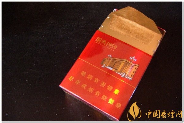 人民大會堂國典1959外包裝色調呈現為雙色系,一面為鮮紅色,另一面為金黃色。在正面的開盒的部位上有著金色的 “人民大會堂”字樣。煙盒的中間部分略上是“國典1959”,接著是人民大會堂圖案。煙盒的下部分是警示語言,“吸煙有害健康,盡早戒煙有益健康”。 該款香煙的煙盒背面是金黃色調,上部分是也就是煙盒的左上角是“國典1959”,煙盒的正中是天安門禮燈圖案。