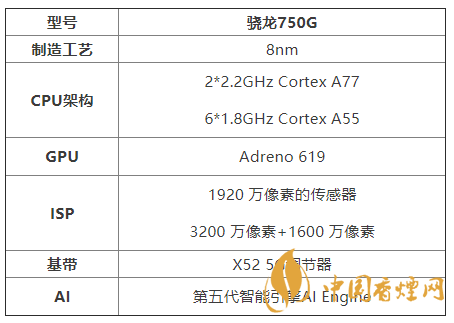 驍龍750G采用三星8nmEVU制程工藝,CPU由兩顆2.2GHz的Cortex A77核心和六顆1.8GHz的Cortex A55小核組成,性能較驍龍730G提高20%; GPU則為Adreno619, 性能較驍龍730G提高10%;