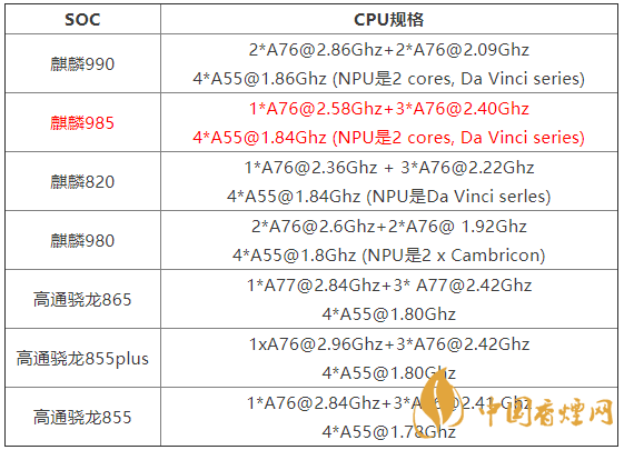 從規(guī)格來看,麒麟985定位于麒麟820、麒麟9905g之間, 采用1個a76 (2.58ghz) +3個a76(2.4ghz)+4個a55 (1.84ghz) , 搭載雙核達芬奇npu。同時集成八核心mali-g77gpu,以及麒麟990同款的雙核心npuai單元、isp5.0圖像 單元。