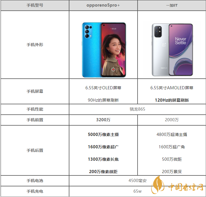 opporeno5pro+采用的是6.55英寸OLED屏幕,是一款90Hz的屏幕。一加8T采用的是6.55英寸AMOLED屏幕,為用戶(hù)帶來(lái)今年最好的直板柔性屏幕,支持120Hz的屏幕顯示