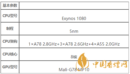 三星Exynos1080的CPU采用了“1*A78(2.84GHz)+3*A78(2.6GHz)+4*A55(2.0GHz)”八核心架構,GPU是Mail—G78(10核)。