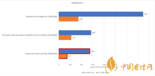 MacBook Air 在 Geekbench 5 的單核和多核測試中都碾壓了 Surface Pro X。蘋果的新筆記本在單核過程中獲得了 1730 分,比 Surface 的分數高出 1000 多分。多核測試則顯示出更大的差距,MacBook Air 的成績為 7454 分,而 Surface 的成績為 2734 分。