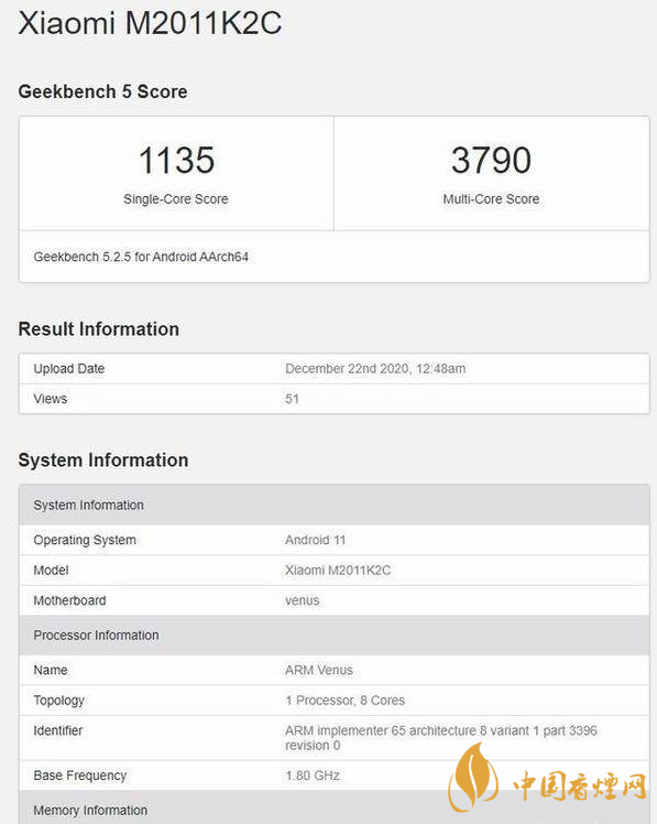 在小米官方宣布完小米11的發布時間之后,有博主對小米11再次開啟了新一輪的細節爆料。數據顯示,小米11主頻可達 1804 MHz,擁有12GB運存,運行安卓 11,跑分的最高一次成績是 1135 的單核得分以及多核 3790 的多核得分。