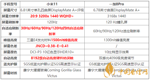 小米11和一加8Pro屏幕參數對比