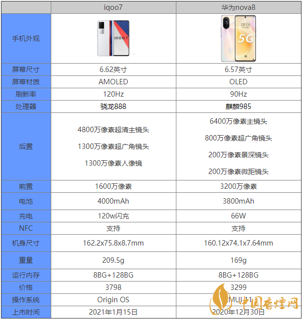 近期剛剛發布的iqoo7手機,許多朋友對這款手機非常關注,那么對比華為nova8這兩款手機有什么區別,哪款手機更好,哪款手機更值得入手?下面香煙網小編將對iqoo7和華為nova8參數配置對比進行介紹,感興趣的朋友一起來看看吧!