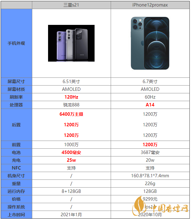 三星s21是一款即將發(fā)布的新款手機(jī),許多小伙伴對(duì)這款手機(jī)一直十分關(guān)注,那么對(duì)比蘋(píng)果12promax這款手機(jī)有什么區(qū)別?哪款手機(jī)更值得入手?下面香煙網(wǎng)小編將對(duì)三星s21和蘋(píng)果12promax的參數(shù)對(duì)比進(jìn)行介紹,感興趣的朋友一起來(lái)看看吧!
