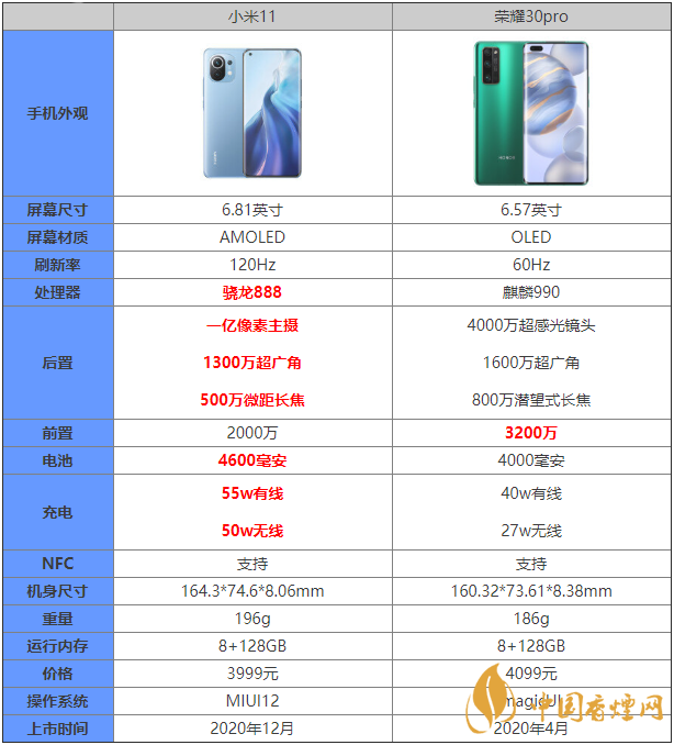 小米11作為今年最強(qiáng)機(jī)型,許多小伙伴對(duì)這款手機(jī)都十分關(guān)注,那么這款手機(jī)和榮耀30pro這兩款手機(jī)的區(qū)別是什么?哪款手機(jī)更值得入手?下面香煙網(wǎng)小編為大家?guī)?lái)最新的小米11和榮耀30pro參數(shù)對(duì)比,感興趣的朋友快來(lái)看看吧。