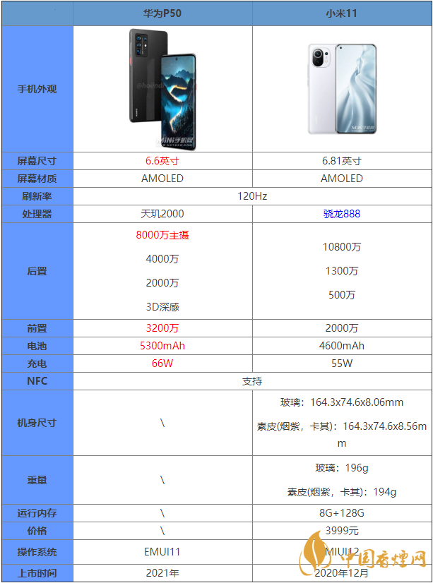 近期,即將華為P50新機(jī)發(fā)布,那么華為P50和小米11有什么區(qū)別?哪款手機(jī)更值得入手?許多小伙伴都十分關(guān)注,接下來香煙網(wǎng)小編將為大家介紹華為P50和小米11參數(shù)對比,想要入手這兩款手機(jī)的朋友一起來看看吧!