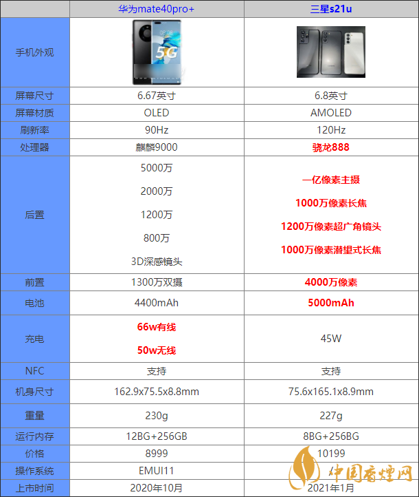 三星s21ultra和華為mate40pro+作為近期新發手機中的佼佼者,那么這兩款手機的區別是什么?哪款手機更值得入手?接下來香煙網小編為大家帶來最新的三星s21ultra和華為mate40pro+參數對比,快來看看吧。