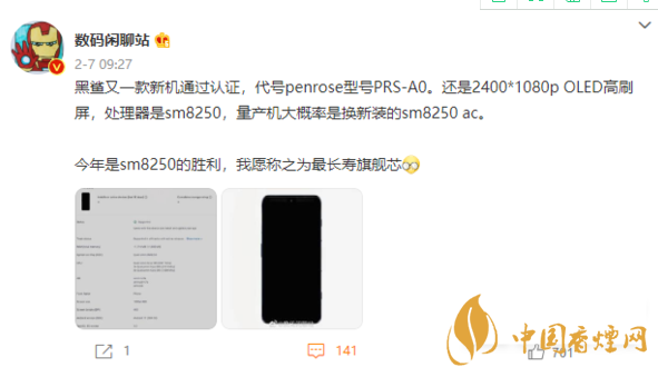 “黑鯊又一款新機(jī)通過(guò)認(rèn)證,代號(hào)penrose型號(hào)PRS-A0。還是2400*1080p OLED高刷屏,處理器是sm8250,量產(chǎn)機(jī)大概率是換新裝的sm8250 ac。”