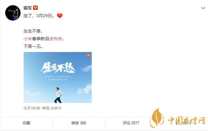 海報中的Slogan是“生生不息”,小米稱“有些重要的事情想要告訴你”。圖中的主角是雷軍,他一身春裝,正向前奔跑。