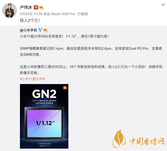 前幾天小米11超大杯預熱的海報里,直接叫板挑戰專業影像!據官方解釋,這顆鏡頭是小米影像和三星用時18個月聯合研發的成果,盧偉冰也直接發博坦言道,小米為這個元器件投入了兩個億!小米去年首發一億像素,今年首發GN2,都投入了大量資金,從這上面就能看到,小米這兩年為了突破相機的天花板而做出的努力!