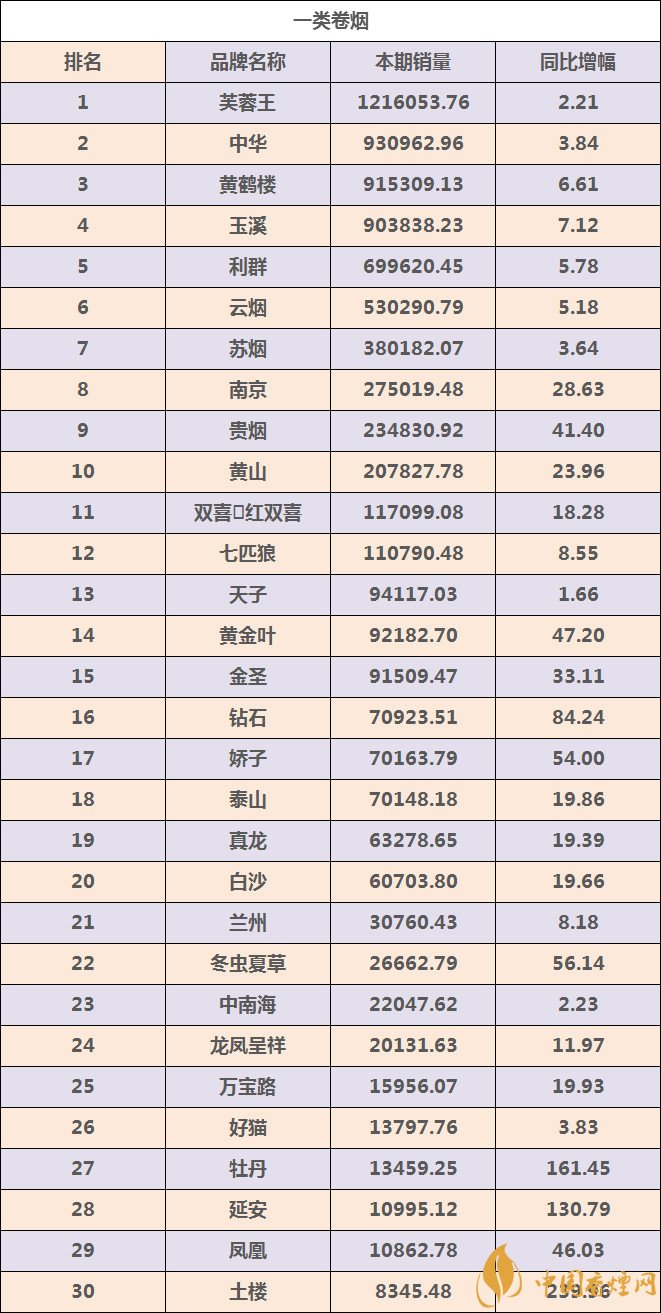 一、一類煙卷煙品牌TOP30強數據信息