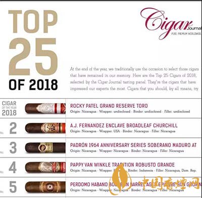 雪茄愛好者看過來,2018年雪茄排行榜來了!2018年排名前十的雪茄有哪些呢?《cigarjournal》組織了品鑒小組評選出2018年前25名雪茄,品鑒小組由來自世界各地的70名雪茄愛好者和專家組成,涵蓋各個年齡層的女性和男性。下面就由香煙網小編帶大家一起來了解一下2018年雪茄排行榜的相關信息。
