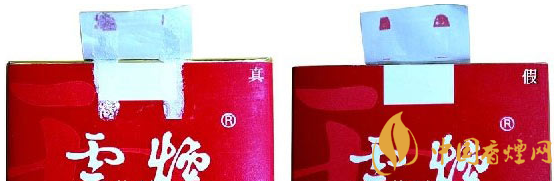 真品卷煙的拉帶頭呈半橢圓形,上下對稱,拉線上有點(diǎn)狀膠痕,俗稱“麻點(diǎn)”;假煙拉帶頭半橢圓形不規(guī)則,拉線上無“麻點(diǎn)”。