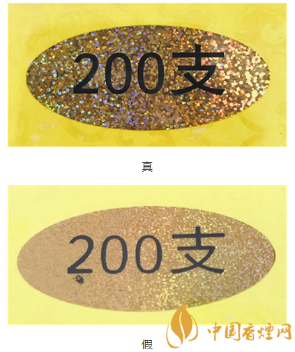真煙條盒上的防偽標志中的熒光顆粒大、清晰;假煙條盒上的防偽標志顆粒小、雜亂。