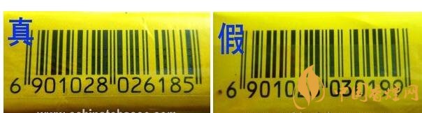 真品小盒條形碼字體和條形碼邊緣均為明顯的鋸齒狀,字體較細小;假煙則無真品特征,而且字體較粗。