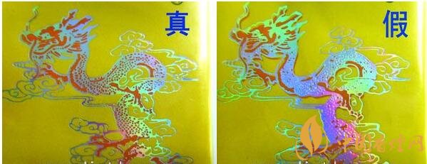 真品小盒正面套印定位燙金“飛龍”圖案鱗片清晰,從頭至尾都能看到定位燙金工藝,紅色貫穿整個龍身,“鱗片”是雪里透紅,栩栩如生;假煙套印定位燙金仿制較差,鱗片無法達到真品的印刷工藝水平,與真品存在明顯差異。