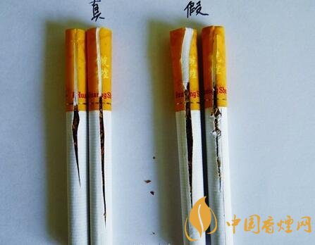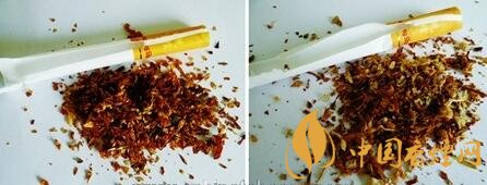 真品煙絲摻配均勻,煙絲顏色呈現出金黃色,油潤性好,含煙末少;假煙煙絲劣質,煙絲顏色為淡黃色,煙絲摻雜質多,煙梗煙末多,與真品煙絲結構存在明顯差異。