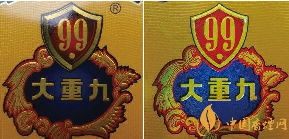 真品小盒商標紙正面印刷工藝以藍色為底燙印“大重九”字樣,邊緣采用精雕細刻雕版燙金技術,套色燙金均勻完整;假煙小盒商標印刷采用“掃描照相”等仿制技術,套色燙金嚴重失真,商標圖案呈現出的效果與真品商標圖案差異明顯。(左真右假)