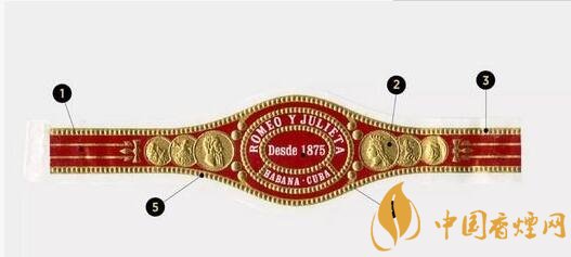 3. 白色字樣:之前的茄標(biāo)上曾印有這樣一句話:“Rodriguez, Argüelles y Cia”,但現(xiàn)在的茄標(biāo)上則印有品牌名ROMEO Y JULIETA、品牌創(chuàng)立年份Desde 1875和產(chǎn)地HABANA·CUBA。