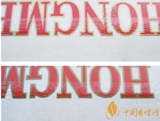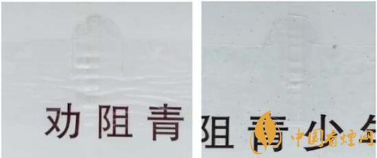 (2)真品卷煙商標印刷采用凹印,色彩交界邊緣呈現鋸齒狀;該款假冒卷煙商標印刷采用膠印色彩交界邊緣光滑。(圖2左真右假)