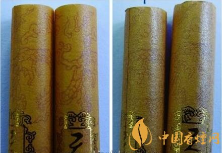 真品小盒商標(biāo)紙圖案樣式借鑒乾隆年代的皇家御用器盒,名為“海水江崖云龍”圖樣,有“龍飛在天,福澤天下”的吉祥寓意,采用雕刻激光定位燙金印刷工藝,圖樣呈現(xiàn)出凹凸有序,層次分明的立體感,真品印刷工藝細(xì)致,圖樣及字體清晰完整無缺;假煙采用仿照技術(shù),圖樣印刷工藝粗糙,脫漆掉色漏印明顯,與真品印刷工藝存在明顯差異。